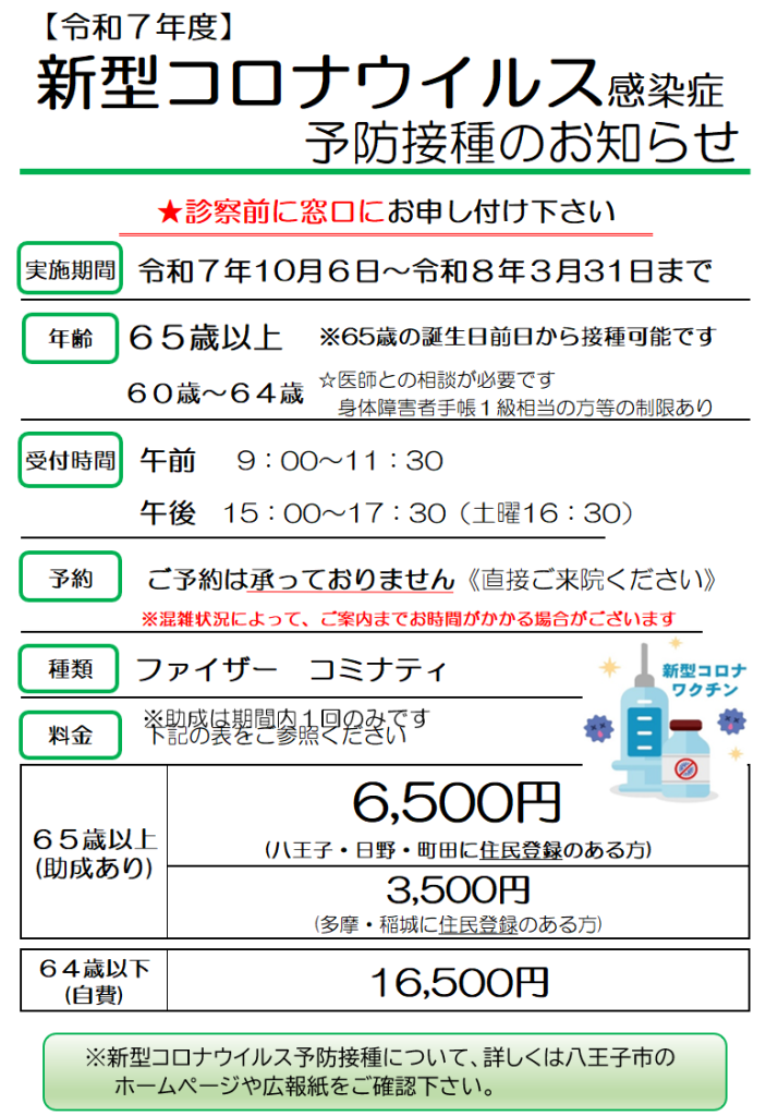 202510.04 共通 令和7年度 高齢者コロナワクチン接種について ※渡辺医院分院では、多摩・稲城に住民登録がある方への対応はできませんので、ご注意ください※ 新型コロナウイルス感染症予防接種について|八王子市公式ホームページ